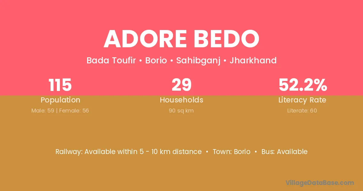 Adore Bedo village has a total population of 115 people, of which 59 are males and 56 are females.