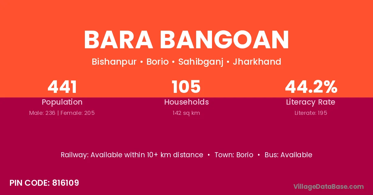 Bara Bangoan village has a total population of 441 people, of which 236 are males and 205 are females.