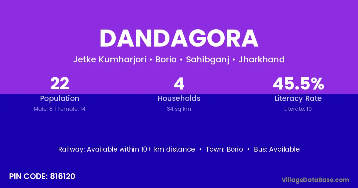 Dandagora village has a total population of 22 people, of which 8 are males and 14 are females.