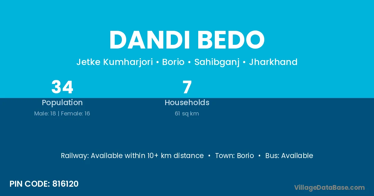 Dandi Bedo village has a total population of 34 people, of which 18 are males and 16 are females.