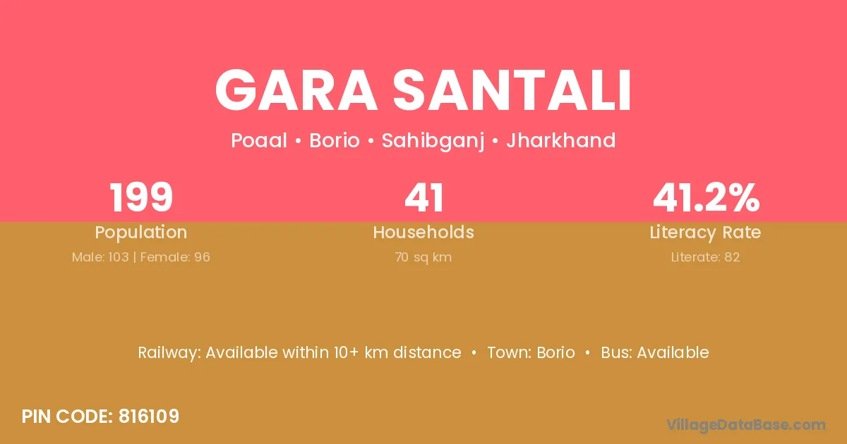 Gara Santali village has a total population of 199 people, of which 103 are males and 96 are females.