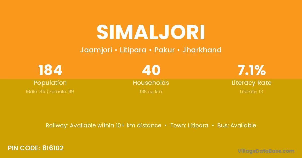 The literacy rate of Simaljori village is 33.89%. Male literacy stands at 40.37% and female literacy at 28.46%.