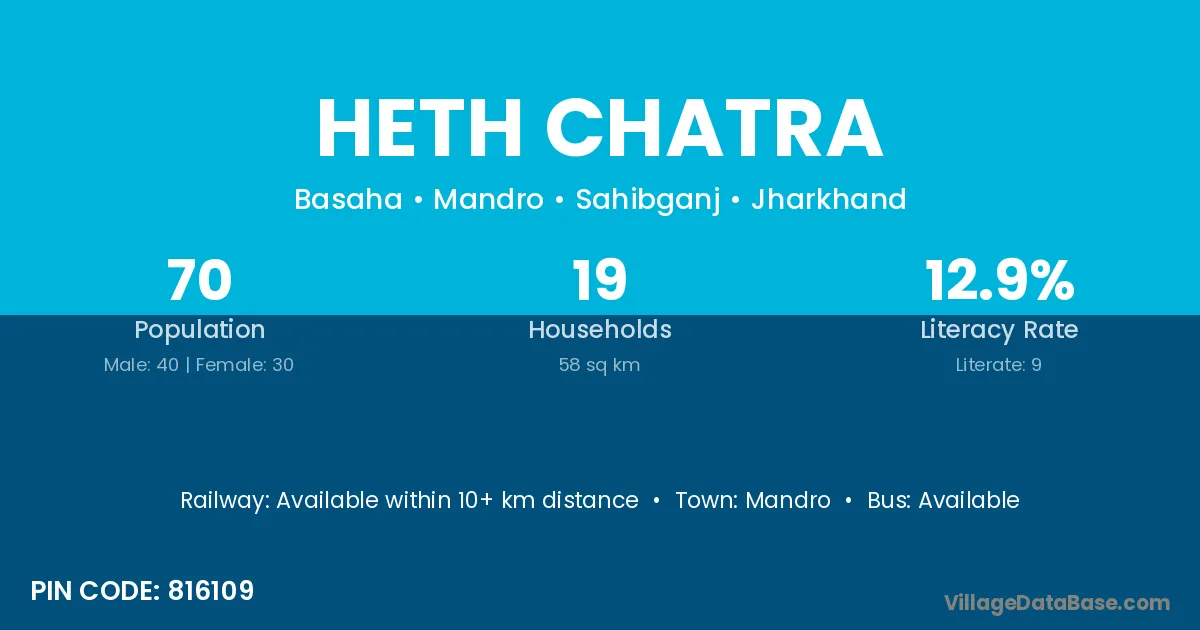 The literacy rate of Heth Chatra village is 12.86%. Male literacy stands at 17.50% and female literacy at 6.67%.