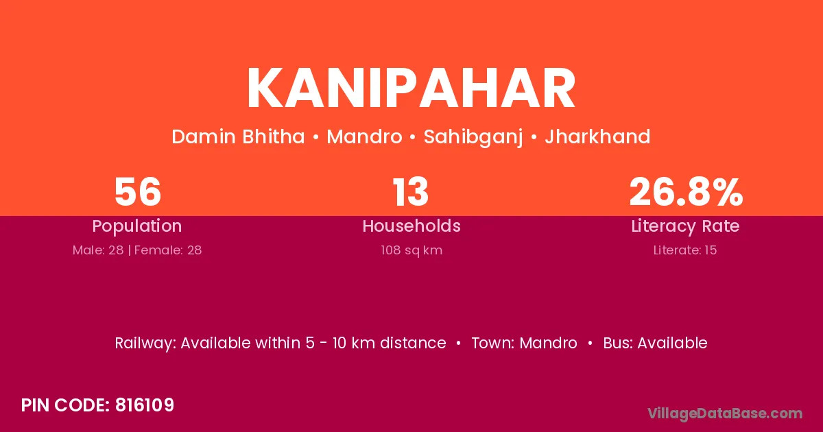 Kanipahar village has a total population of 56 people, of which 28 are males and 28 are females.