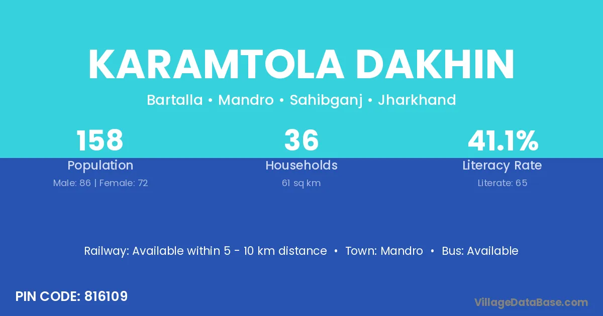 Karamtola Dakhin village has a total population of 158 people, of which 86 are males and 72 are females.