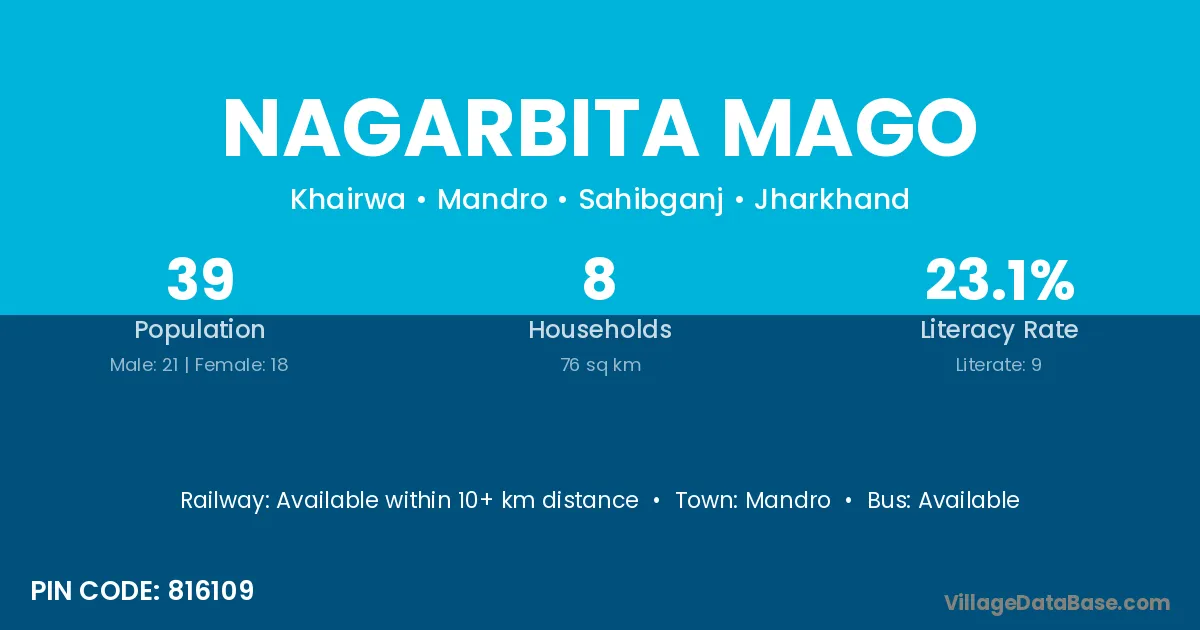Nagarbita Mago village has a total population of 39 people, of which 21 are males and 18 are females.