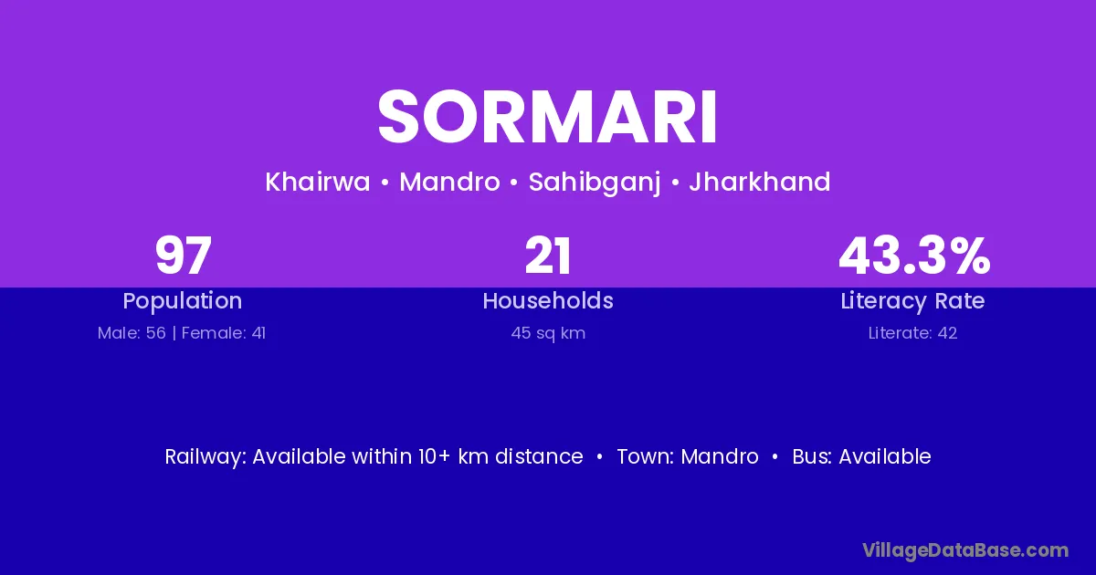Sormari village has a total population of 97 people, of which 56 are males and 41 are females.