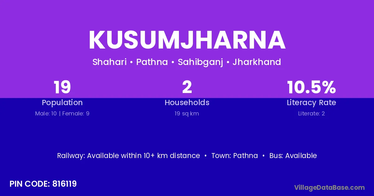 Kusumjharna village has a total population of 19 people, of which 10 are males and 9 are females.
