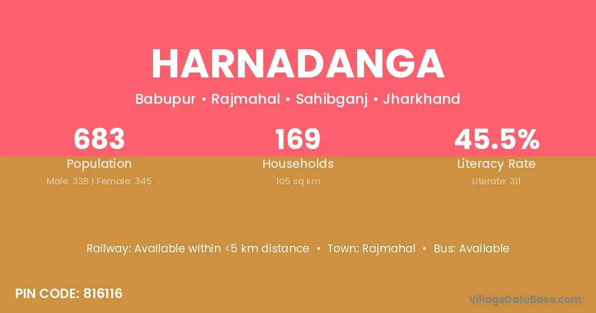 Harnadanga village has a total population of 683 people, of which 338 are males and 345 are females.