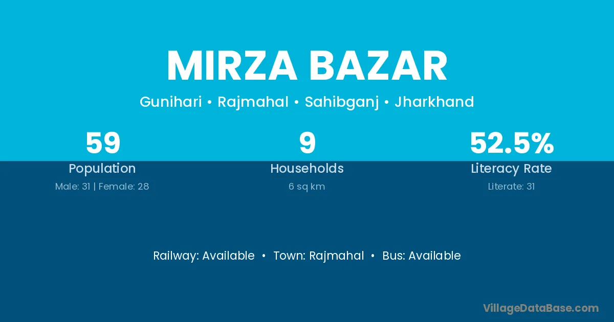 Mirza Bazar village has a total population of 59 people, of which 31 are males and 28 are females.