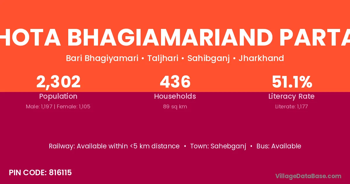 Chhota Bhagiamariand Partaba village has a total population of 2,302 people, of which 1,197 are males and 1,105 are females.