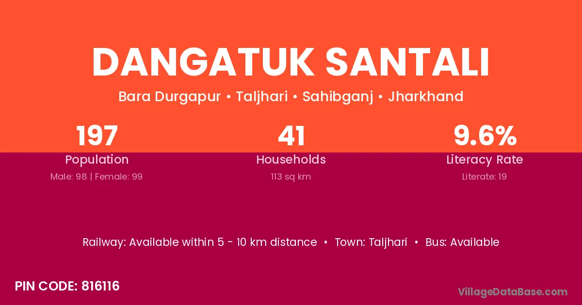 Dangatuk Santali village has a total population of 197 people, of which 98 are males and 99 are females.