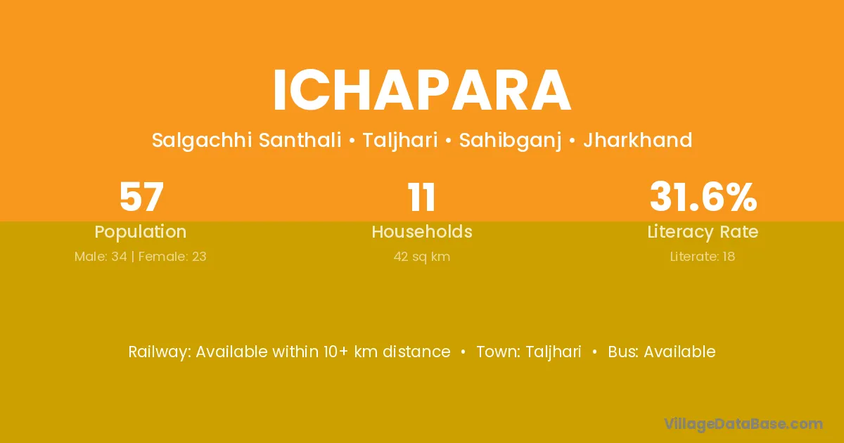 The literacy rate of Ichapara village is 31.58%. Male literacy stands at 41.18% and female literacy at 17.39%.