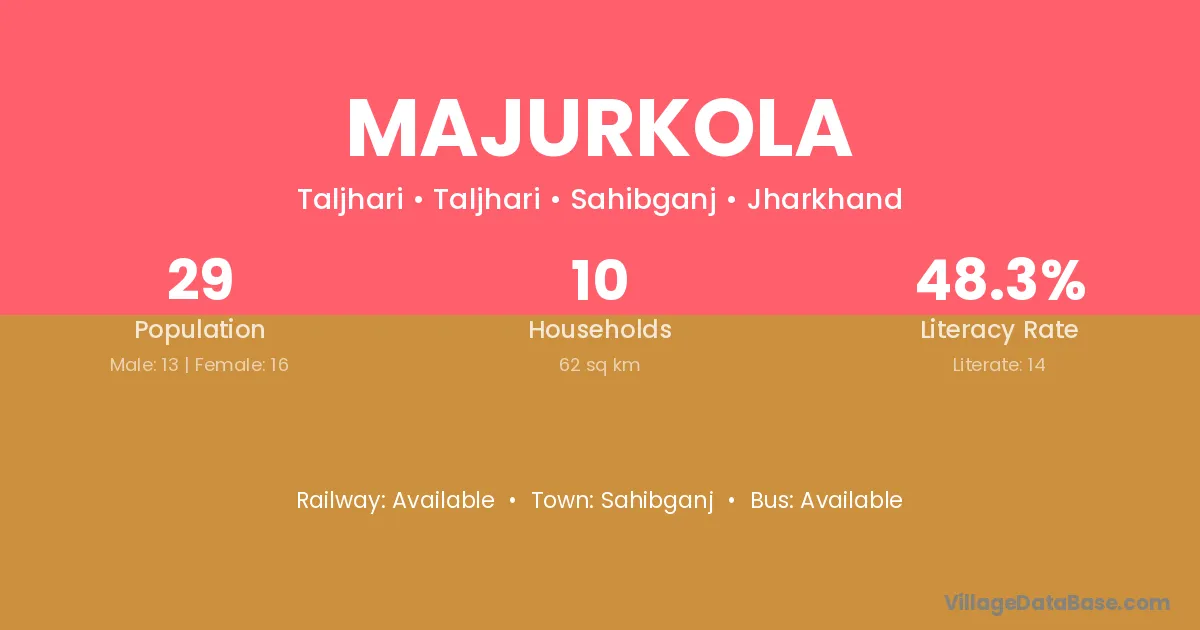 Majurkola village has a total population of 29 people, of which 13 are males and 16 are females.