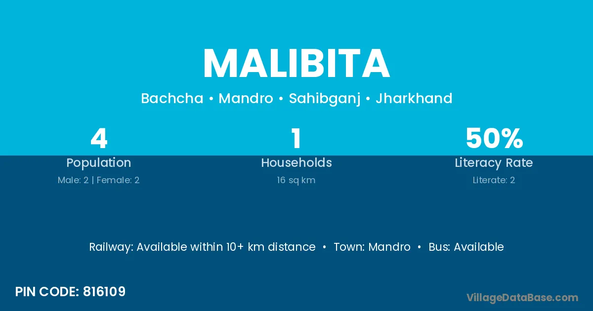 The literacy rate of Malibita village is 16.39%. Male literacy stands at 20.00% and female literacy at 12.90%.