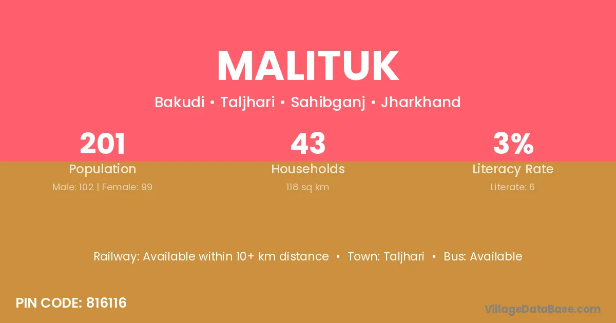 The literacy rate of Malituk village is 2.99%. Male literacy stands at 3.92% and female literacy at 2.02%.