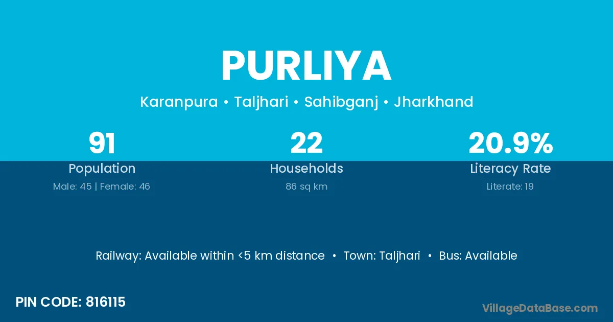 Purliya village has a total population of 91 people, of which 45 are males and 46 are females.