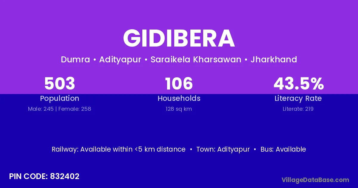 Gidibera village has a total population of 503 people, of which 245 are males and 258 are females.