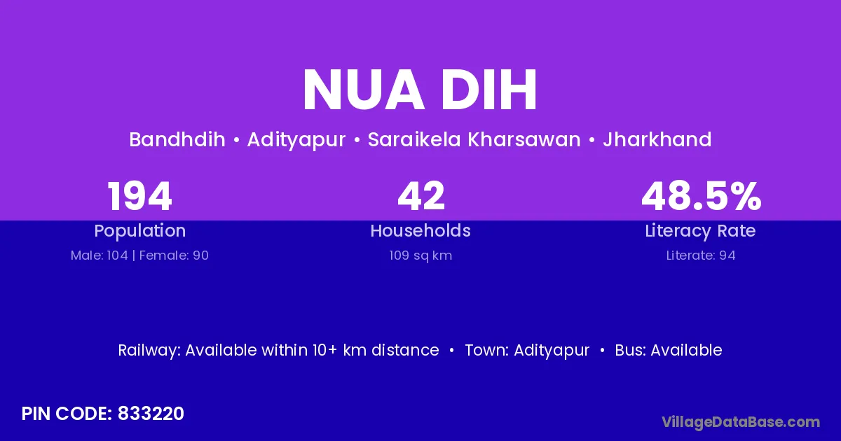 Nua Dih village has a total population of 194 people, of which 104 are males and 90 are females.