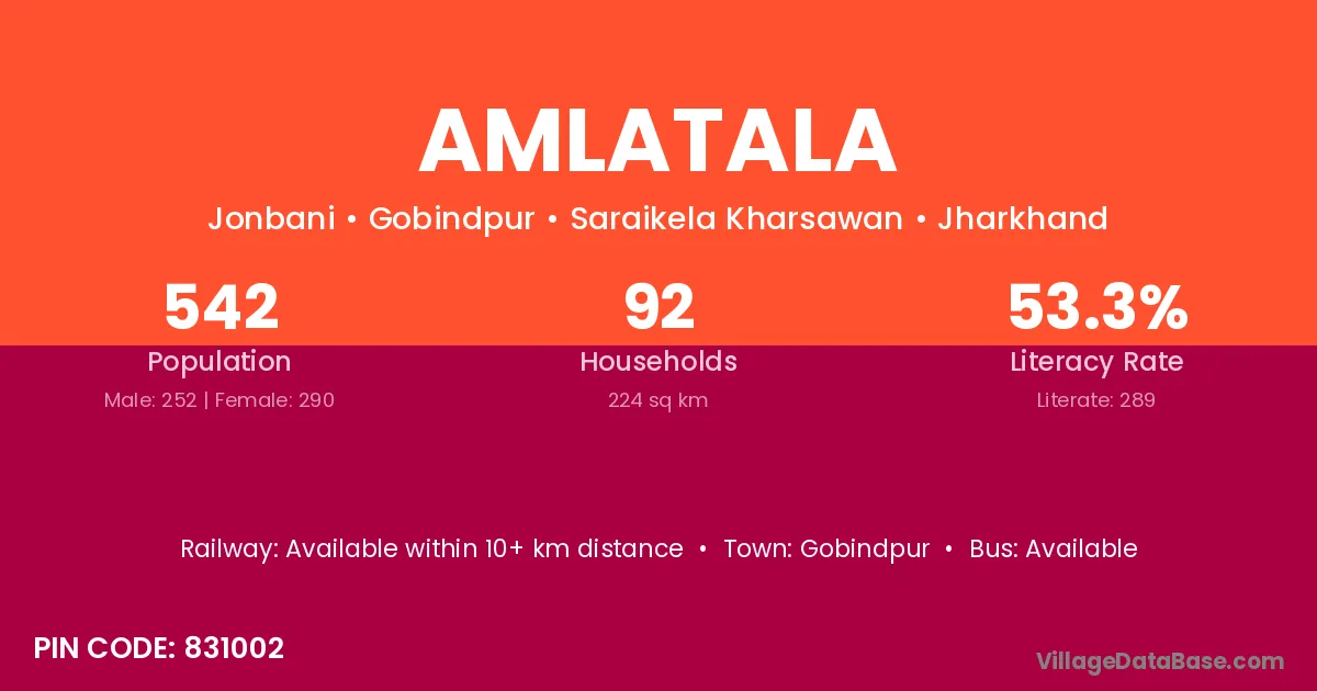 Amlatala village has a total population of 542 people, of which 252 are males and 290 are females.