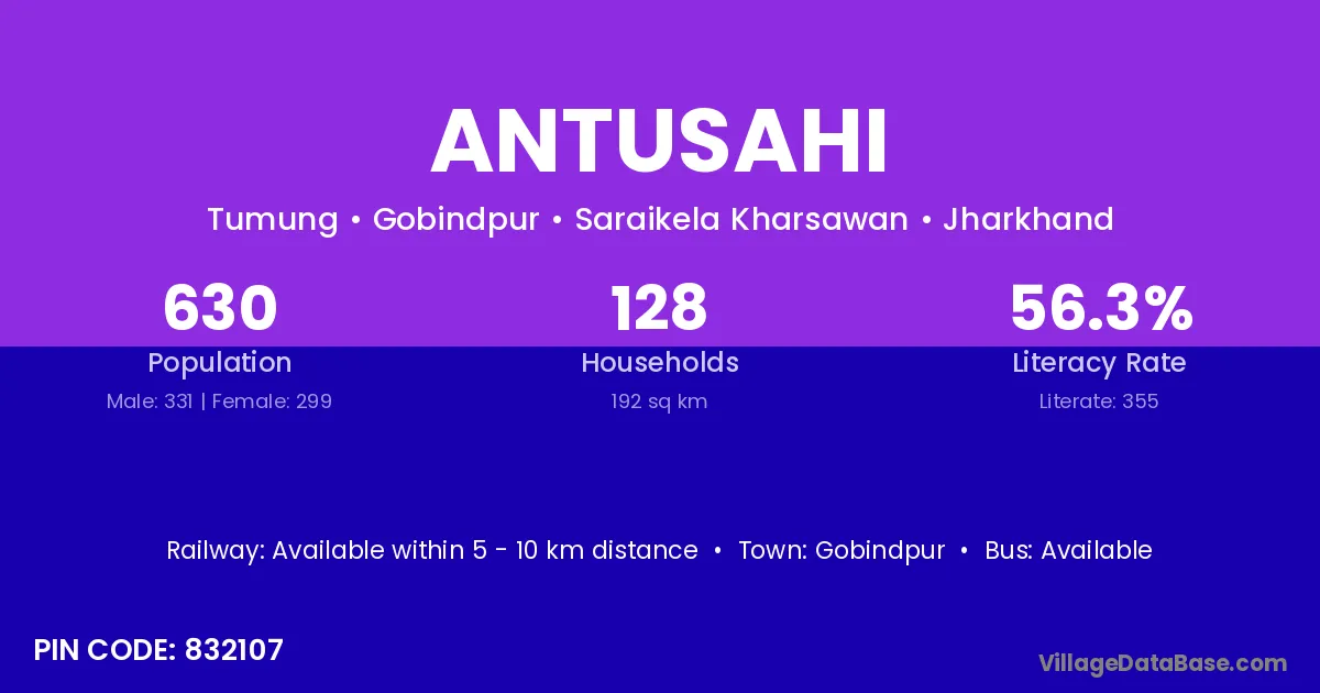 Antusahi village has a total population of 630 people, of which 331 are males and 299 are females.
