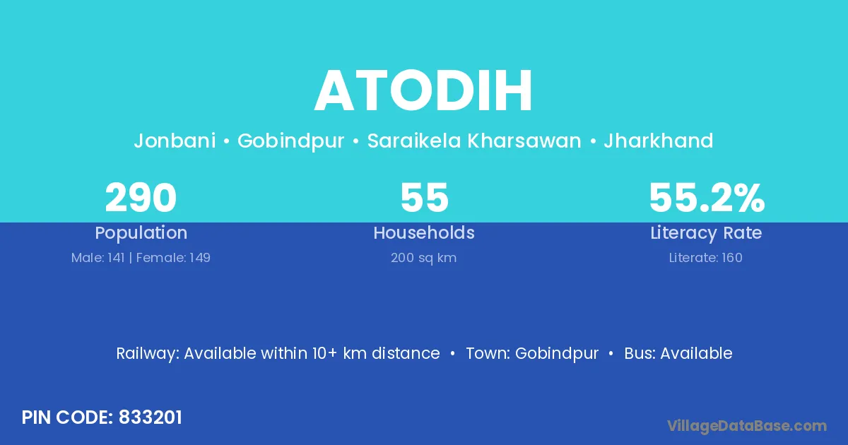 The literacy rate of Atodih village is 55.17%. Male literacy stands at 71.63% and female literacy at 39.60%.