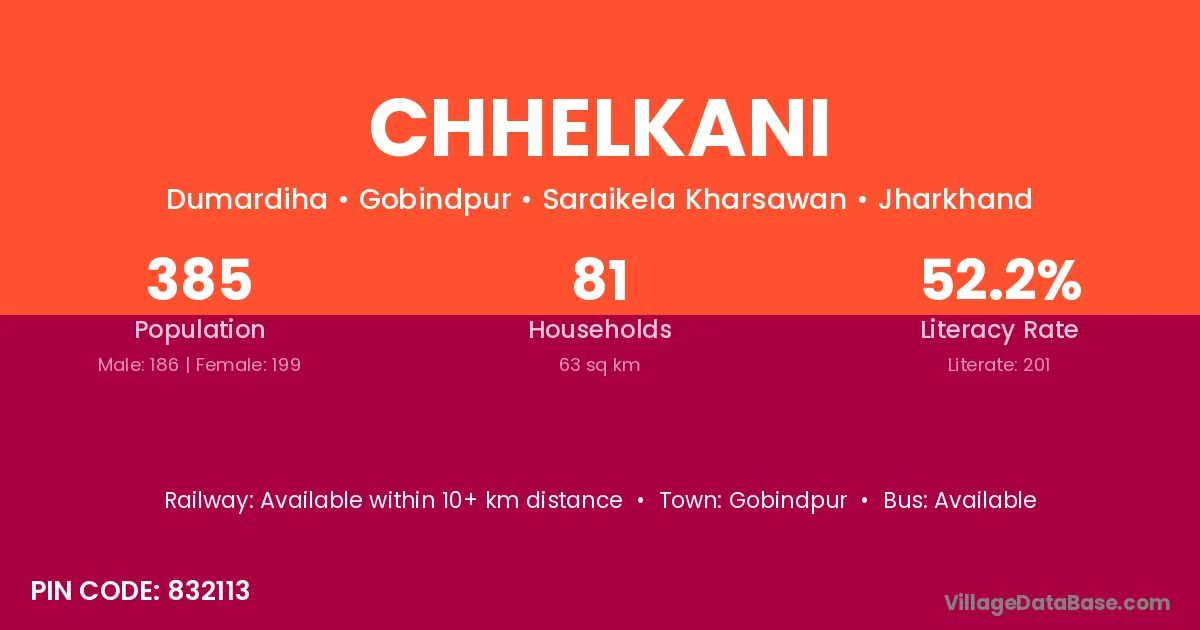 Chhelkani village has a total population of 385 people, of which 186 are males and 199 are females.