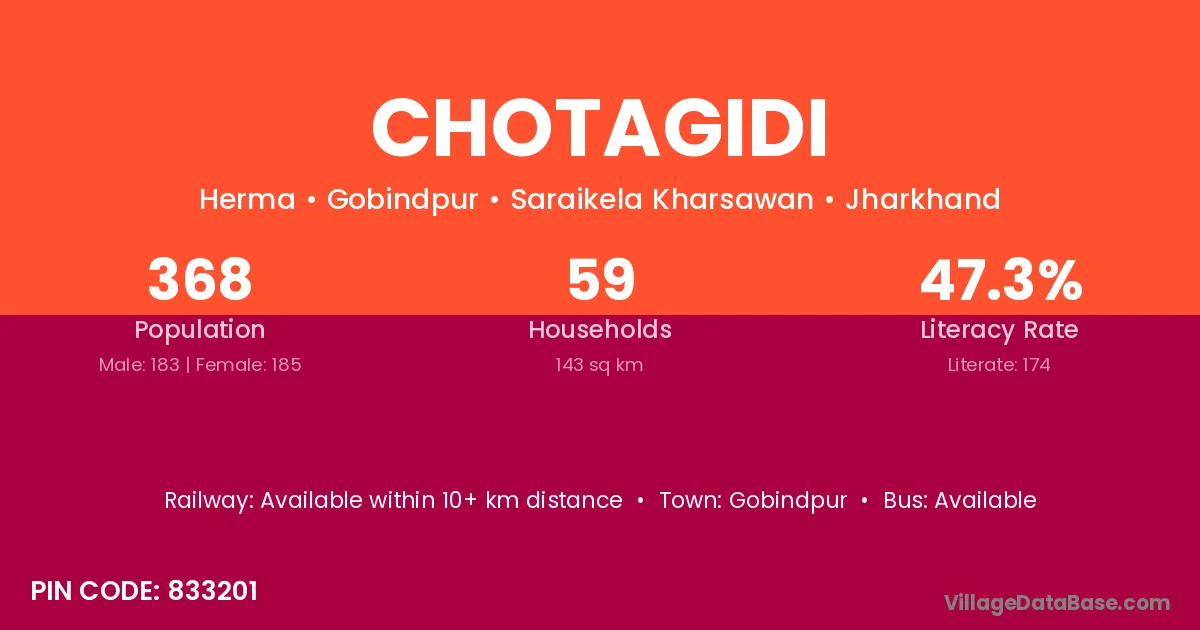 Chotagidi village has a total population of 368 people, of which 183 are males and 185 are females.