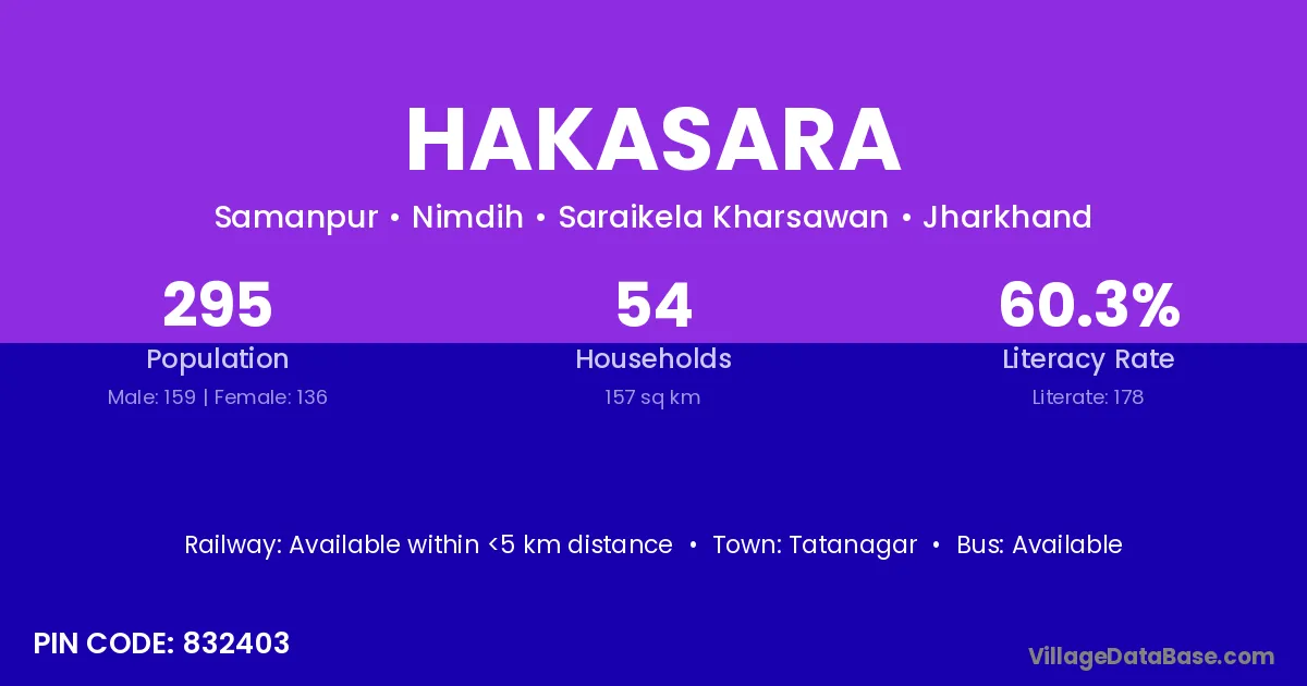Hakasara village has a total population of 308 people, of which 165 are males and 143 are females.