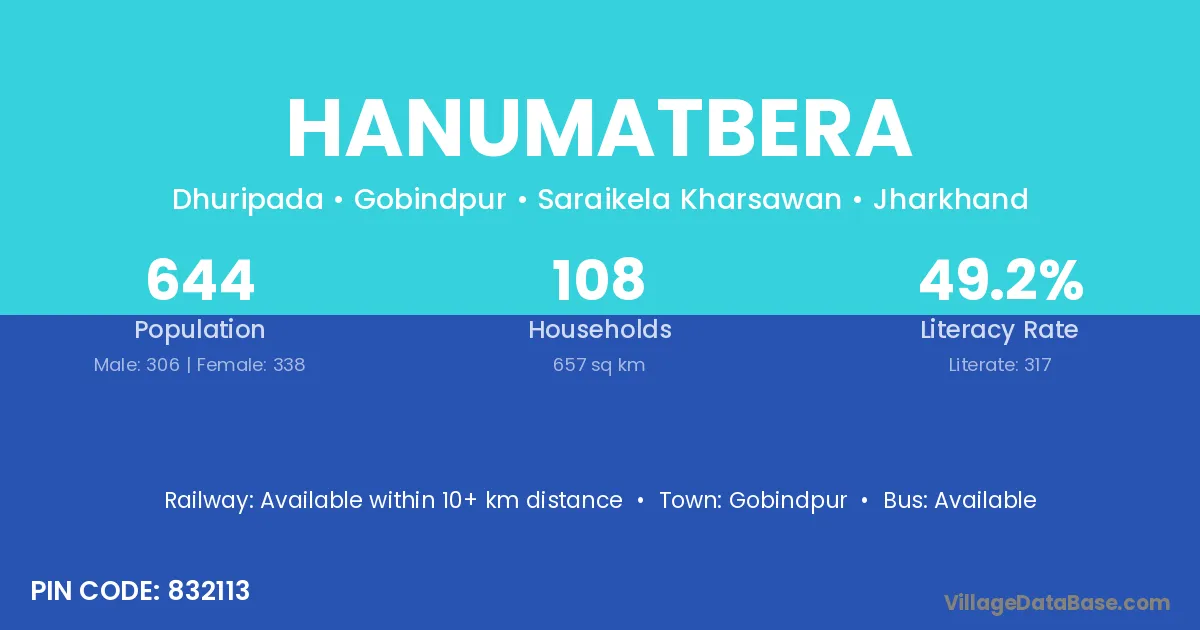 Hanumatbera village has a total population of 644 people, of which 306 are males and 338 are females.