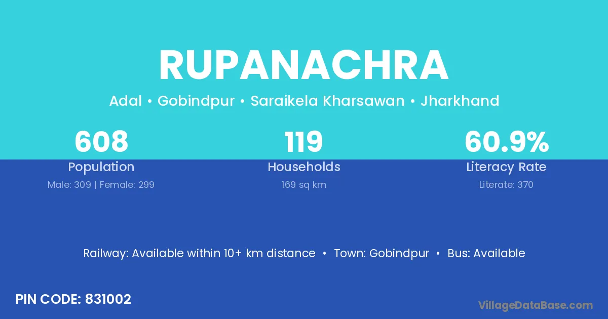 Rupanachra village has a total population of 608 people, of which 309 are males and 299 are females.