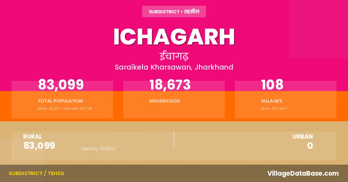 According to the 2011 census The total area of Ichagarh Subdivision is 267 km², with a population of 83099 people. The population density is 311 inhabitants per square kilometre, and there are approximately 18673 houses in the sub district.