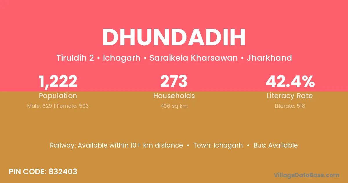 Dhundadih village has a total population of 1,222 people, of which 629 are males and 593 are females.