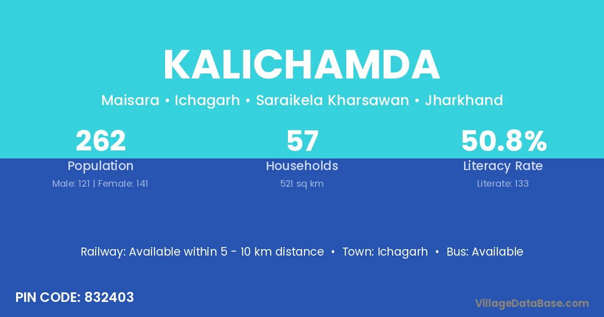 Kalichamda village has a total population of 262 people, of which 121 are males and 141 are females.