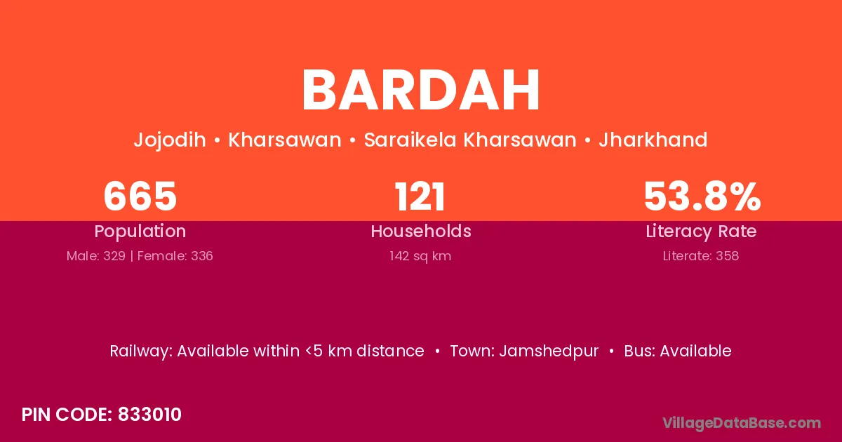 According to Census 2011 information, the village code of Bardah village is 833010.
