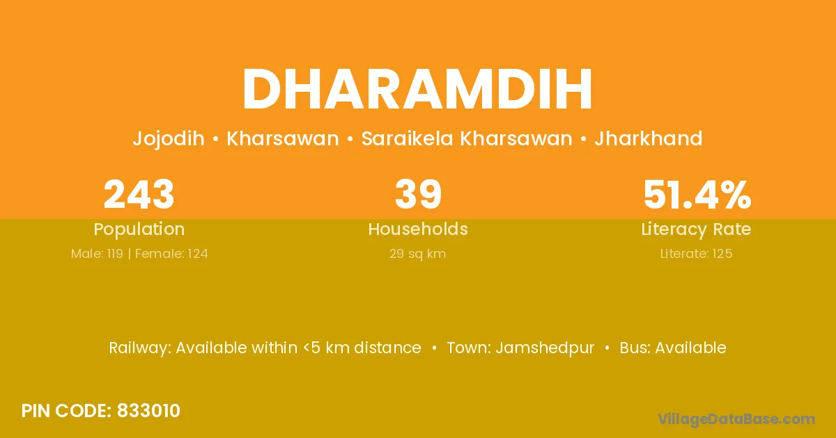 Dharamdih village has a total population of 243 people, of which 119 are males and 124 are females.