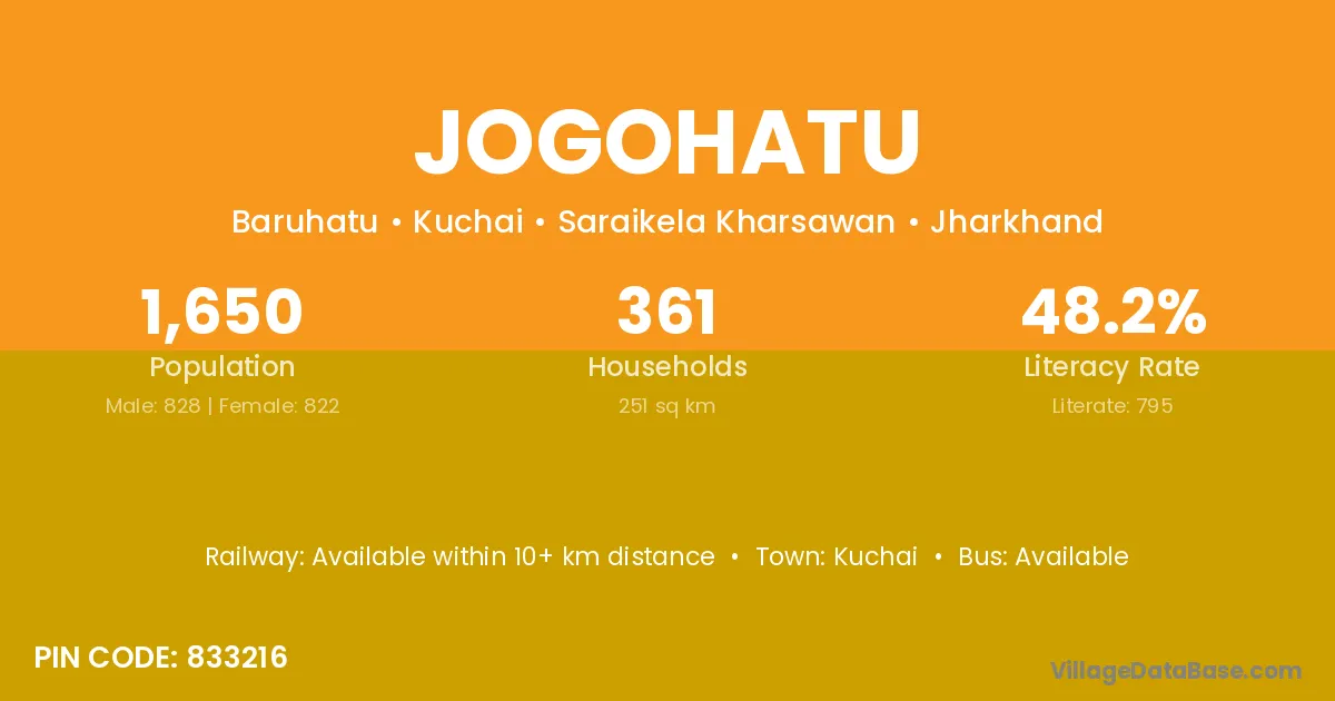 Jogohatu village has a total population of 1,650 people, of which 828 are males and 822 are females.