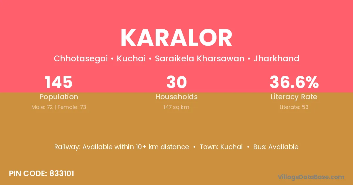 Karalor village has a total population of 145 people, of which 72 are males and 73 are females.