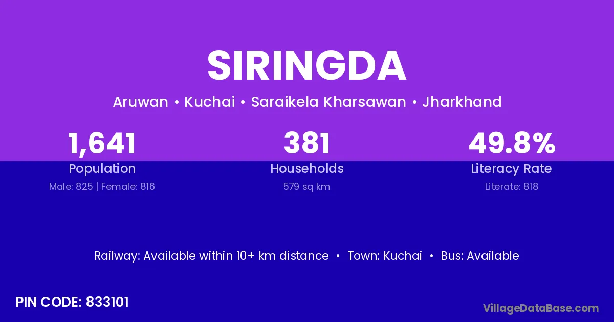 According to Census 2011 information, the village code of Siringda village is 833101.
