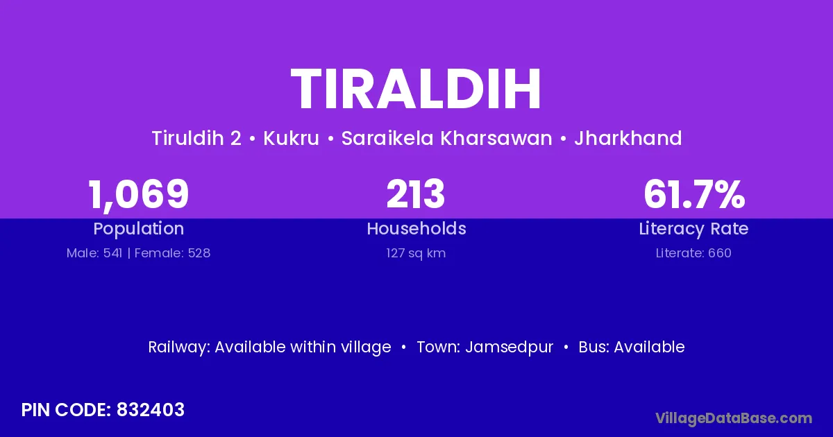 Tiraldih village has a total population of 1,069 people, of which 541 are males and 528 are females.
