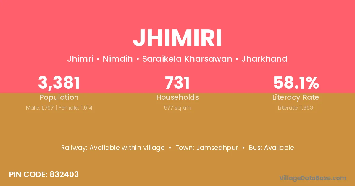 Jhimiri village is located in the Nimdih Subdivision of the Saraikela Kharsawan district in Jharkhand .