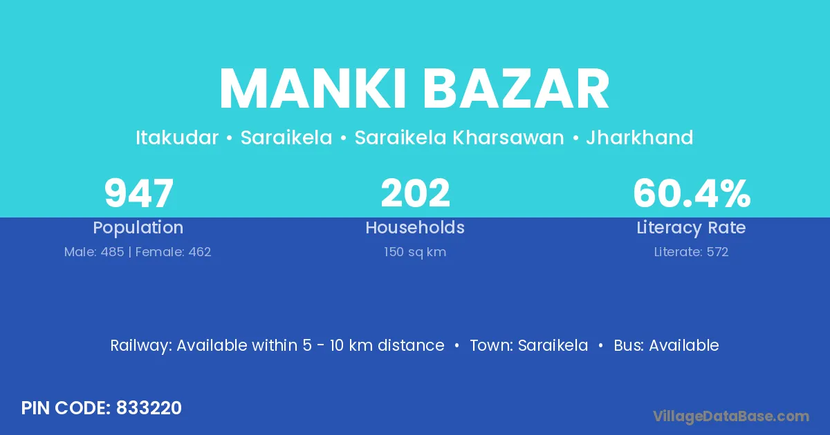 Manki Bazar village has a total population of 947 people, of which 485 are males and 462 are females.