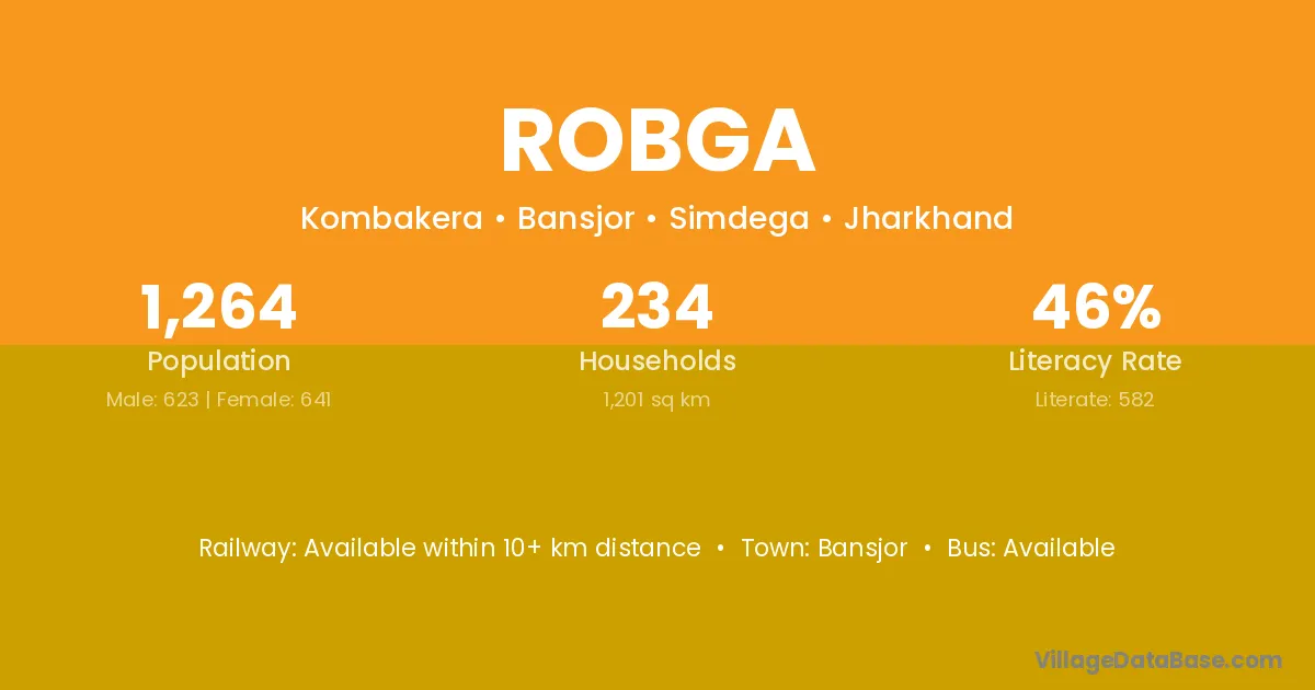 Robga village has a total population of 1,264 people, of which 623 are males and 641 are females.
