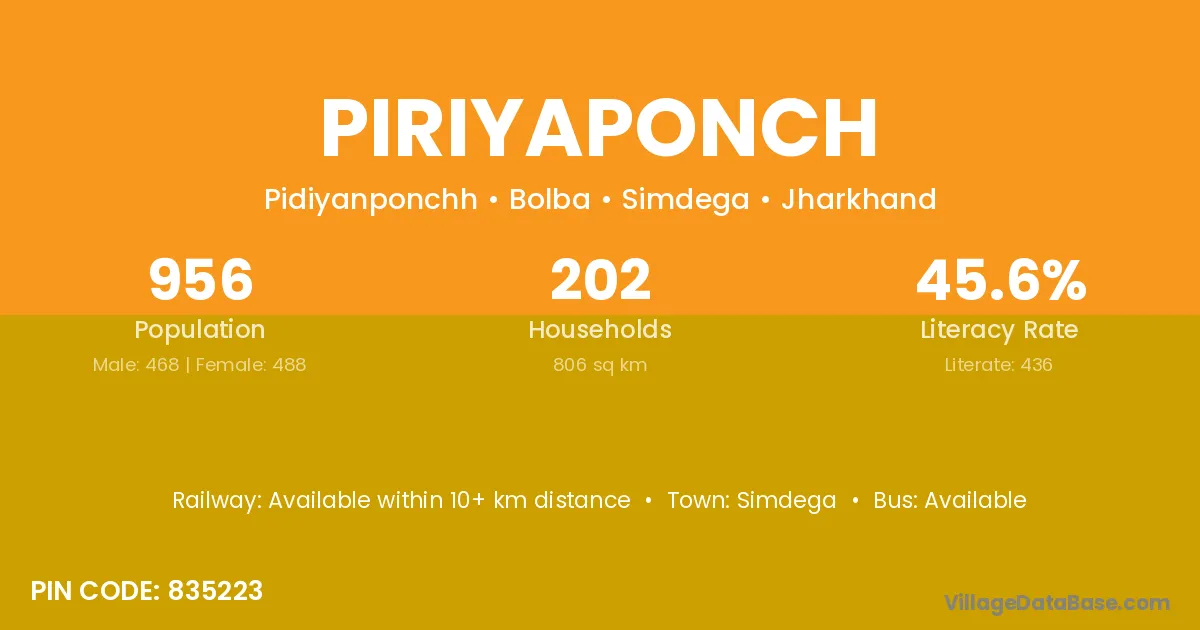Simdega is the nearest town to Piriyaponch village for major economic activities