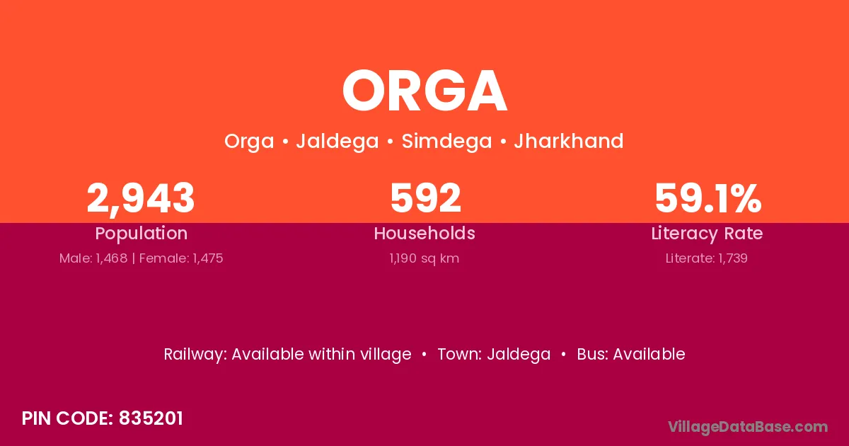 Orga village is located in the Jaldega Subdivision of the Simdega district in Jharkhand .
