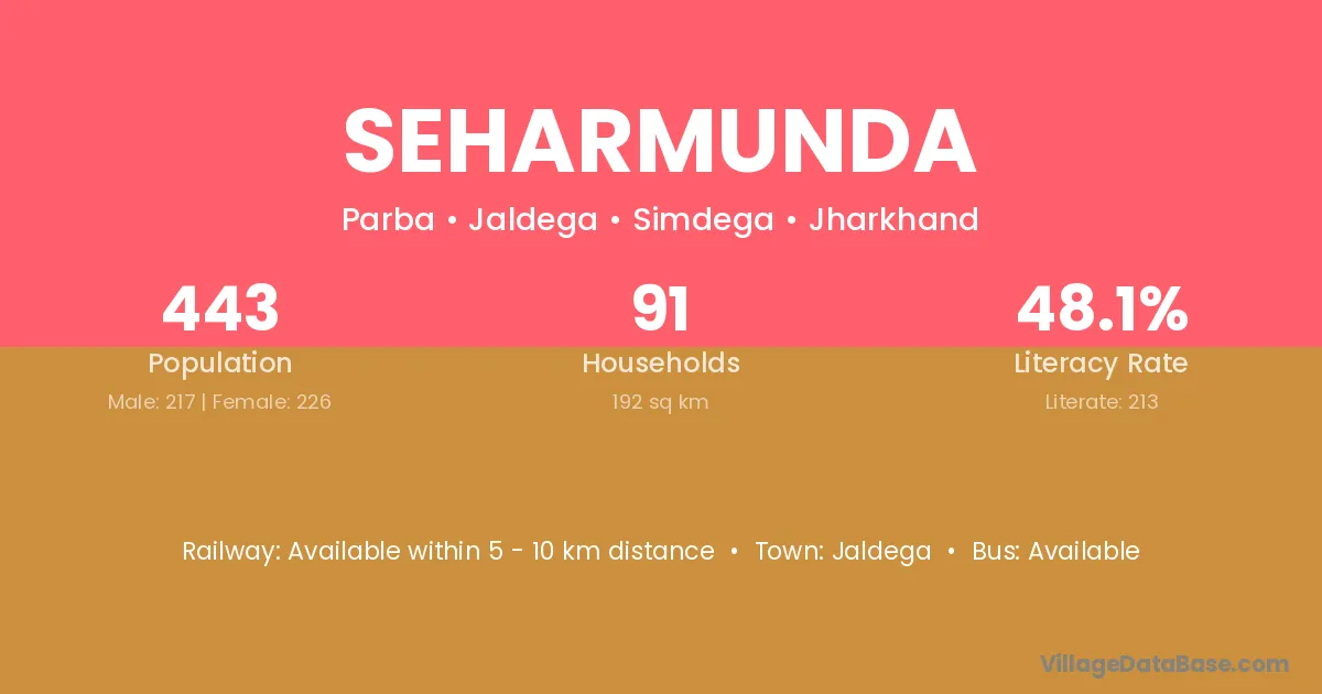 Seharmunda village has a total population of 443 people, of which 217 are males and 226 are females.