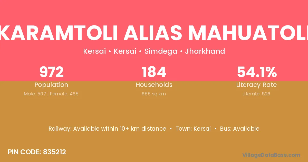 Karamtoli Alias Mahuatoli village has a total population of 972 people, of which 507 are males and 465 are females.