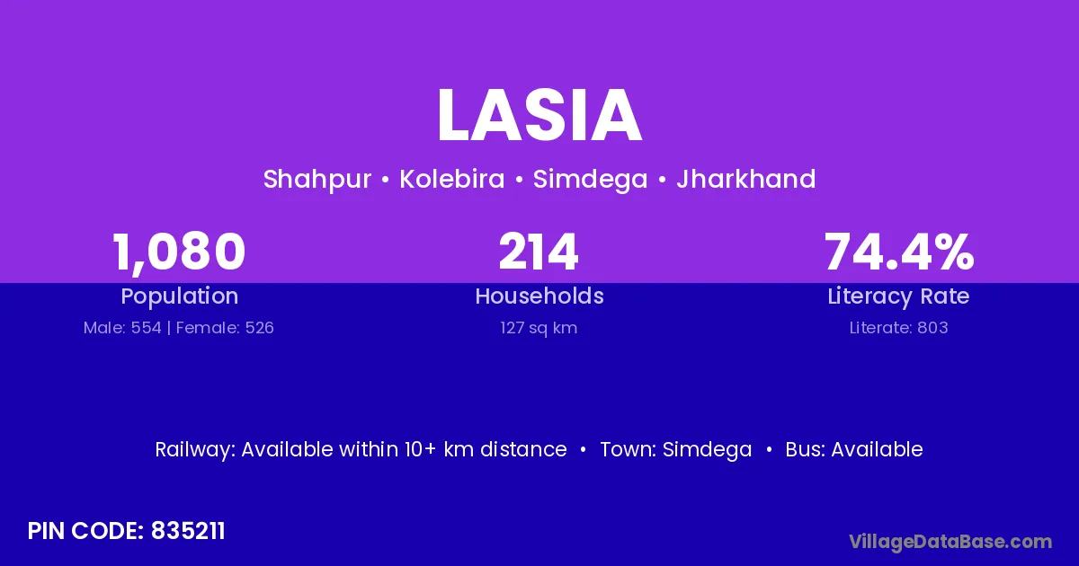 According to Census 2011 information, the village code of Lasia village is 835211.