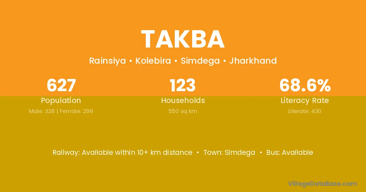 Takba village has a total population of 627 people, of which 328 are males and 299 are females.