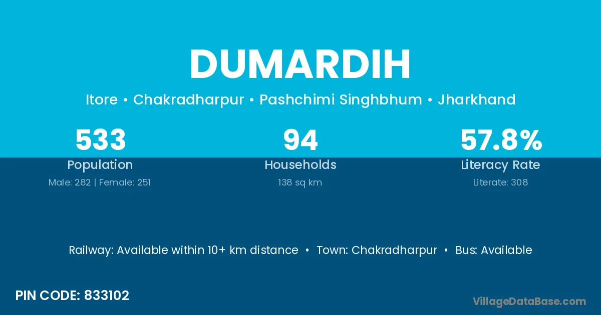 The literacy rate of Dumardih village is 52.73%. Male literacy stands at 59.46% and female literacy at 46.43%.
